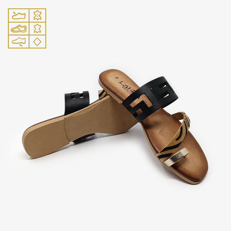 Latika - Ciabattine con fasce incrociate e dettaglio maculato - Nero, Marrone