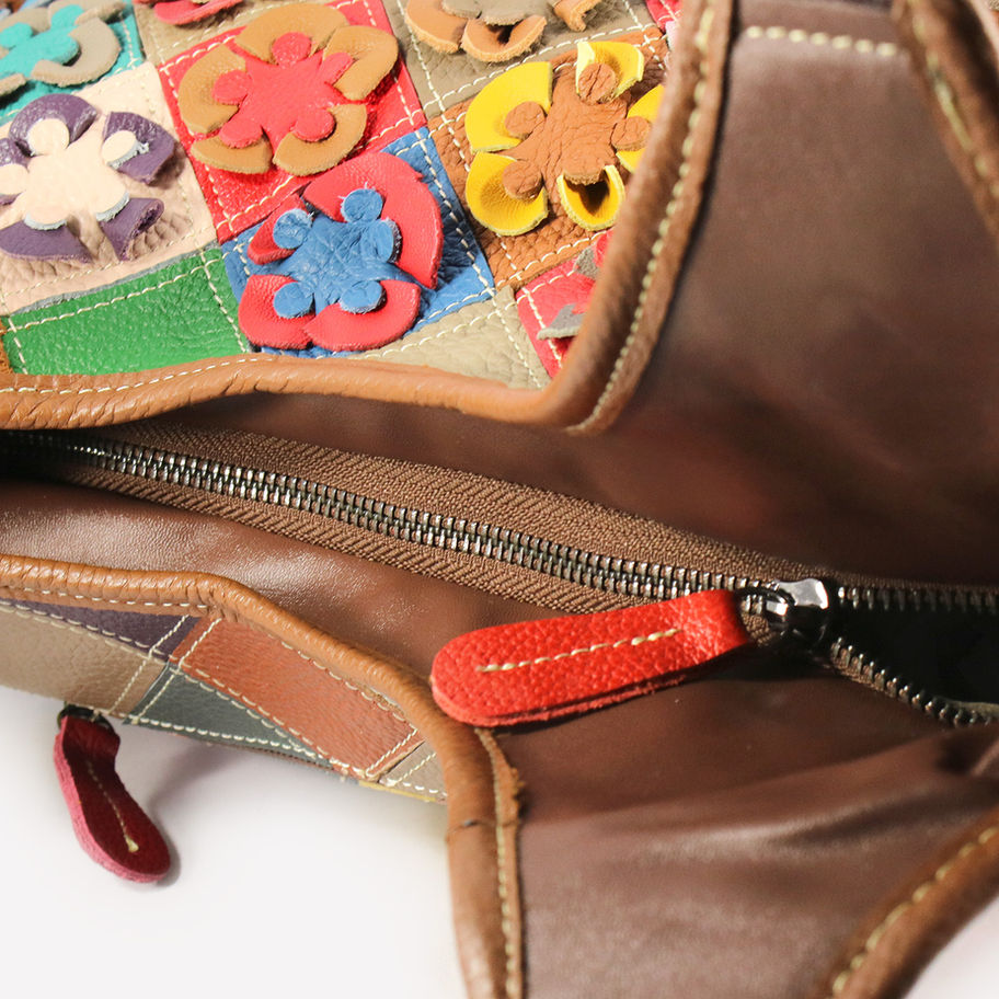 Shopper in vera pelle colorata con fiorellini, la tracolla è amovibile e chiusura con zip.