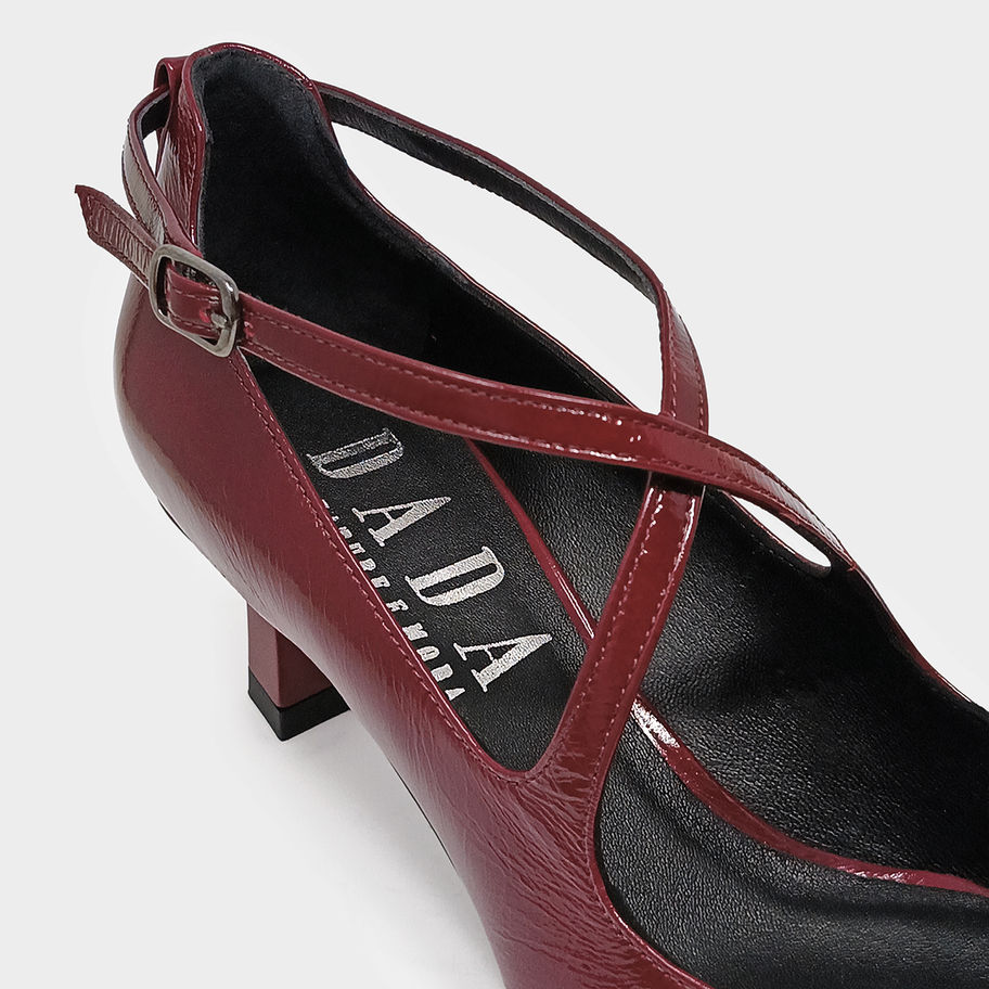 Décolleté a punta in vernice con tacco medio e cinturini incrociati alla caviglia.