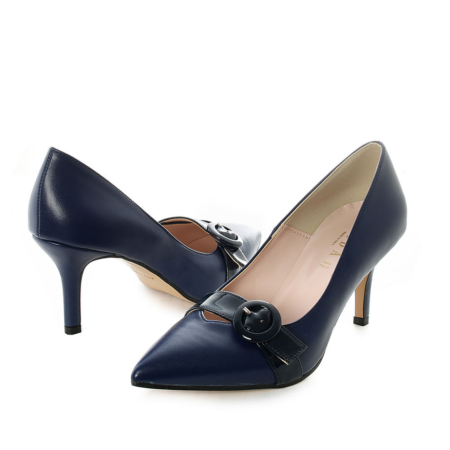 Décolleté con tacco a stiletto, cinturino e fibbia decorativa.