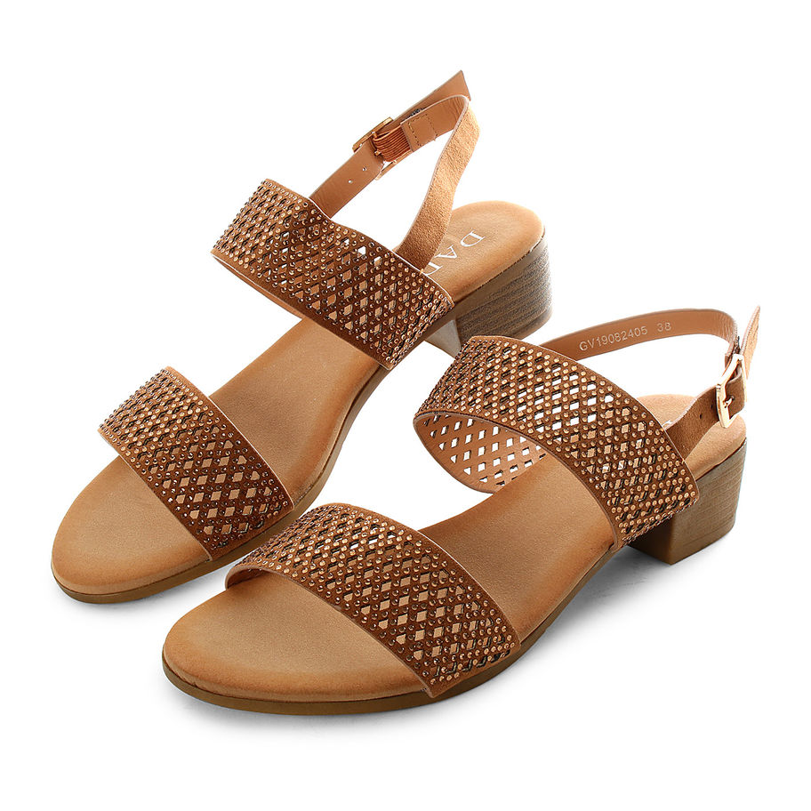 Sandali con tacco a blocchetto, trama con strass decorativi.