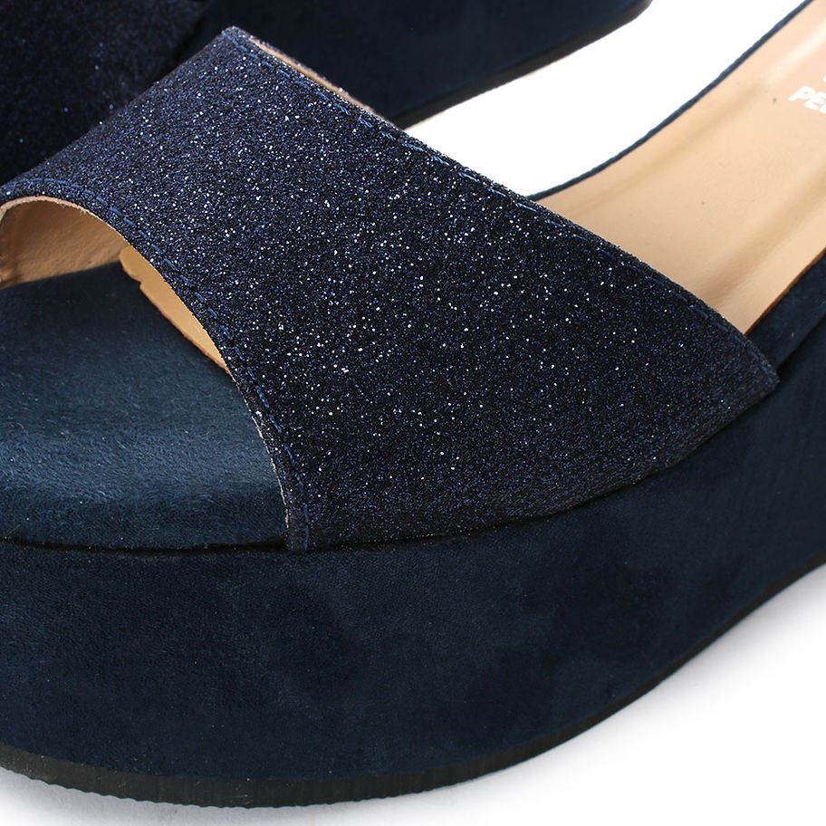 Sandali da donna con soletta in vera pelle, tacco modello zeppa e fascia di glitter.
