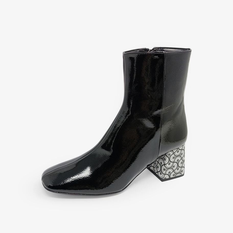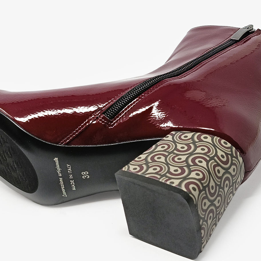 Stivaletti lucidi con tacco fantasia.