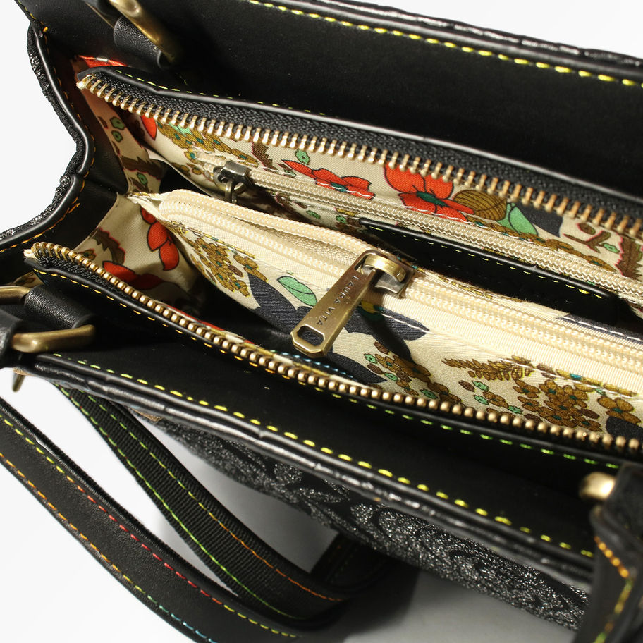 Borsa in Vera Pelle a stampa floreale, chiusura con zip, con tracolla amovibile e regolabile.