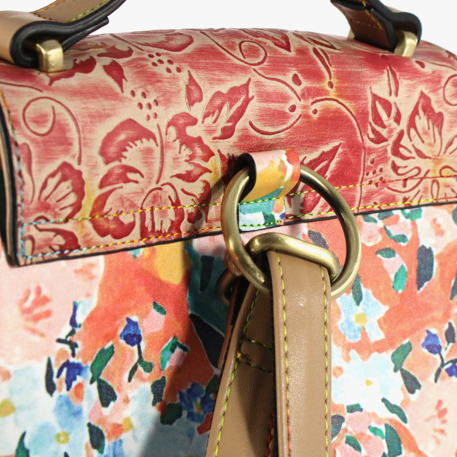 Zaino in Vera Pelle a stampa floreale, chiusura con bottone ad incastro e con tracolla e bretelle amovibili e regolabili.