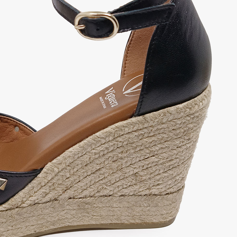 Sandali con cinturino alla caviglia su zeppa, borchiette decorative.